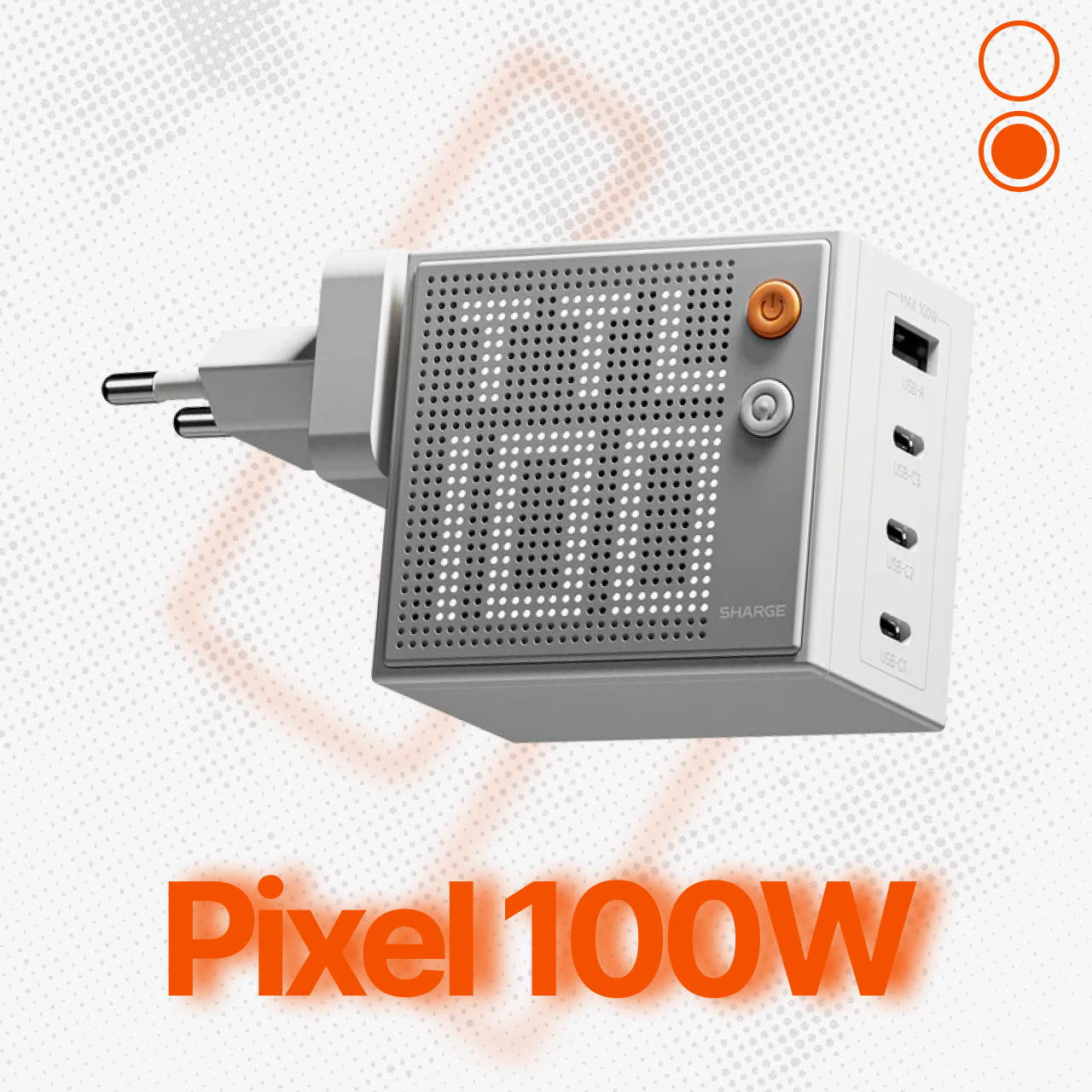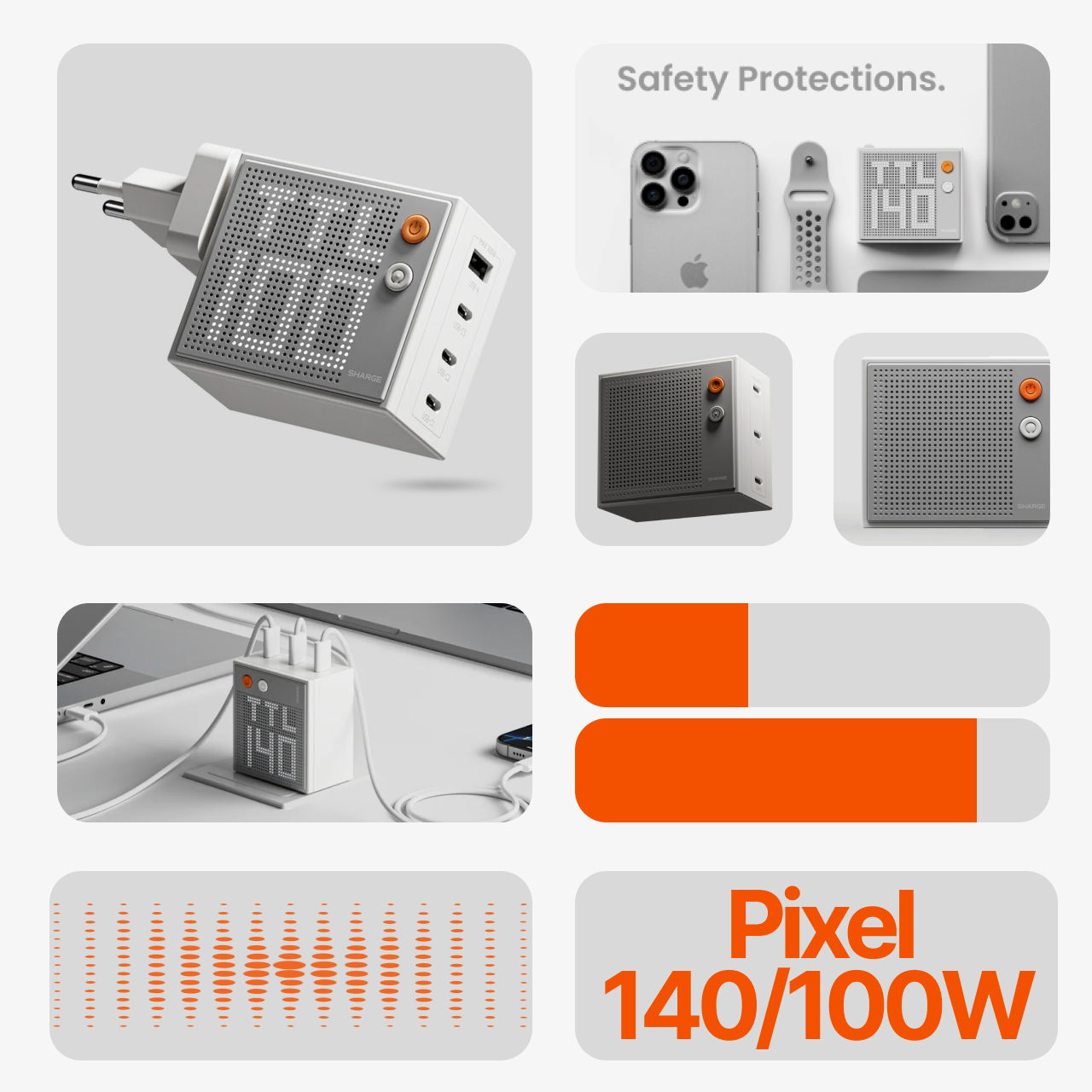 Sharge charger pixel 100W/140W for universal device dilengkapi dengan berbagai port untuk pengisian daya serta dot matrix display sebagai penanda pengisian daya yang hadir dengan dua warna, putih dan abu abu. Satu charger untuk semua device, isi bersamaan dan semakin ringkas !