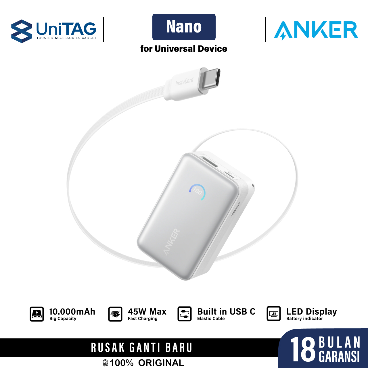 ANKER Powerbank Nano 10000mAh 45W Fast Charging memiliki kapasitas besar 10000 mAh dengan maksimal output 45W disertai built in retractable Cable USB C sehingga lebih praktis saat dibawa bepergian.