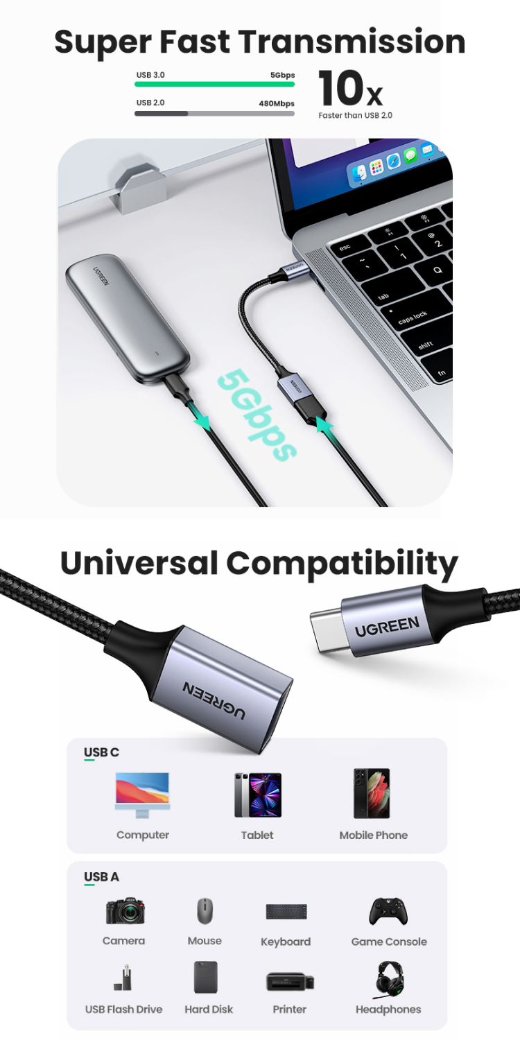 UGREEN USB C Male to USB 3.0 Female OTG Cable 70889 US378 memudahkanmu dalam melakukan transfer data dari flashdisk ke smartphone yang sudah support OTG function.