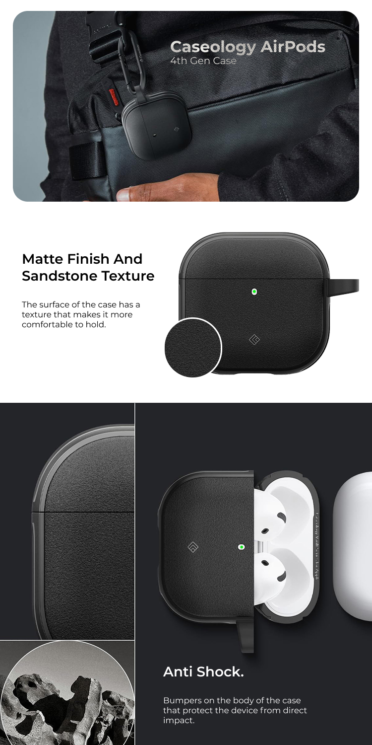 Case Airpods 4th Caseology Vault adalah case yang memiliki fitur yaitu permukaan tekstur kasar menjadikan Pods-mu mudah digenggam, serta carabiner yang memudahkanmu membawa kemanapun tanpa ribet, keep any on-the-go situation!
