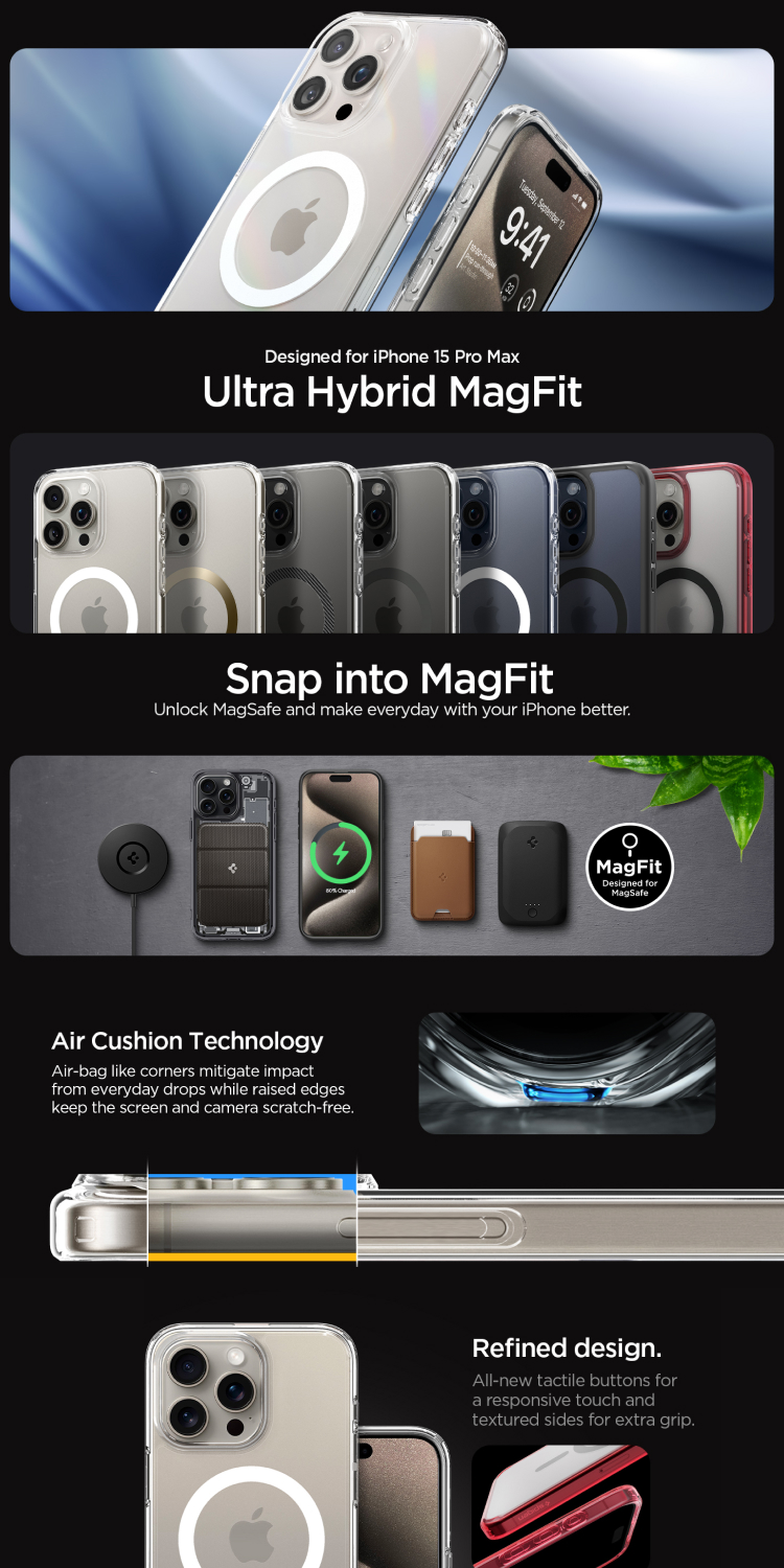 Case iPhone 15 Series Spigen Ultra Hybrid Magfit Merupakan hybrid casing yang terbuat dari campuran bahan TPU (Softcase) dan PC (Hardcase) yang akan melindungi smartphone dari benturan.