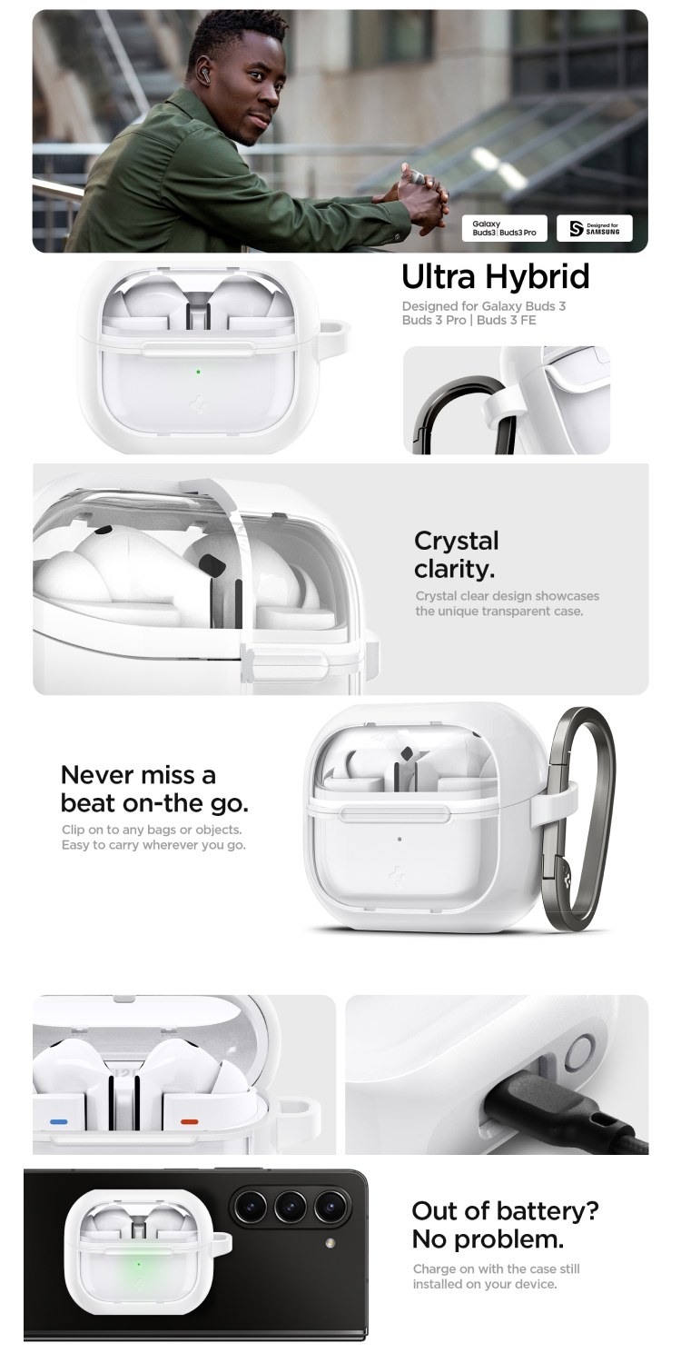 Spigen Ultra Hybrid Clear Case for Samsung Galaxy Buds 3 / Buds 3 Pro / Buds 3 FE adalah case yang cocok untuk kamu yang suka desain canggih dan butuh perlindungan ekstra untuk perangkatmu. Jadikan device-mu tampil beda dan tetap aman!