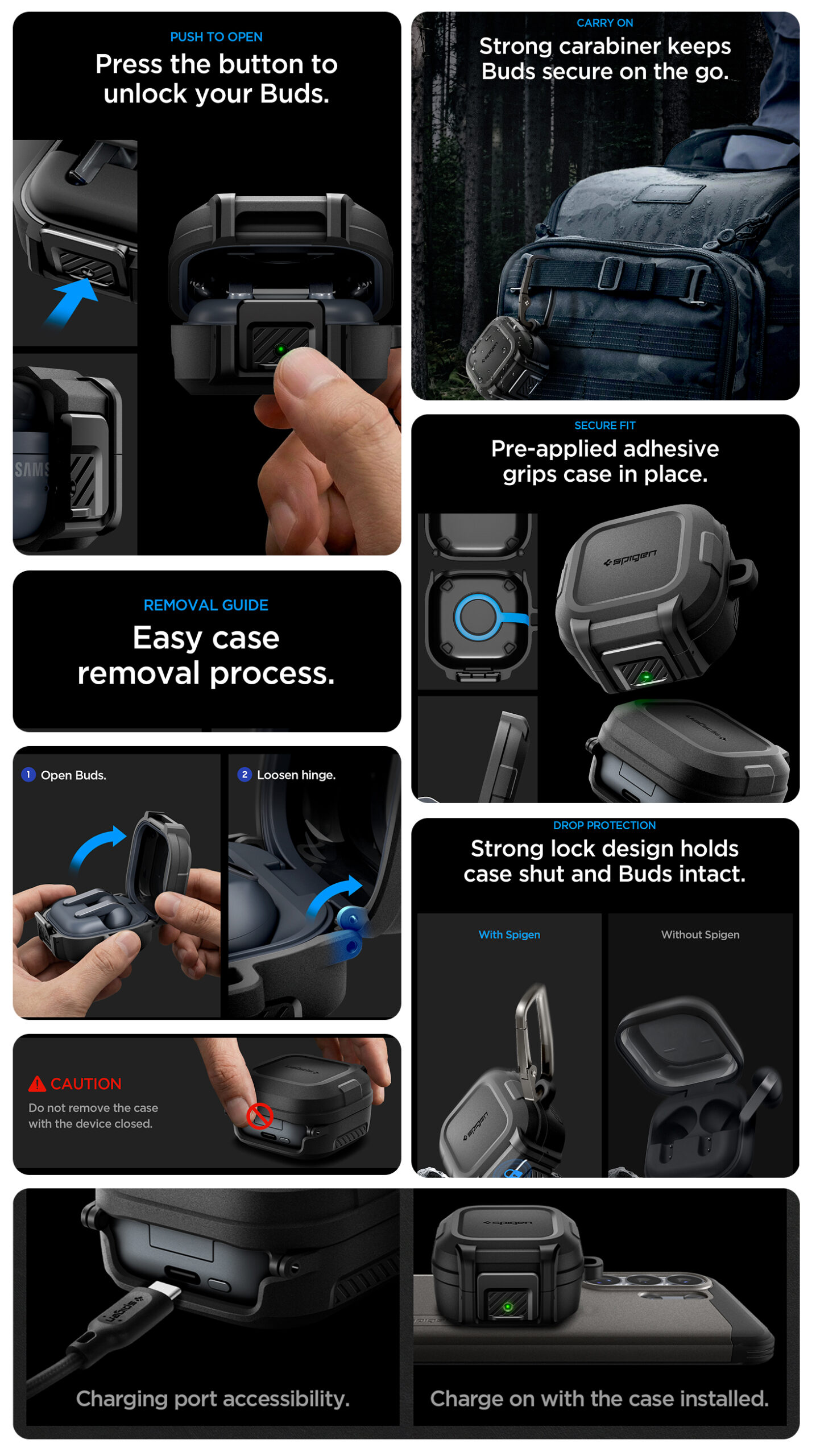 Spigen Lock Fit Case for Samsung Galaxy Buds 4 / Buds 4 Pro menawarkan perlindungan ekstra seperti perlindungan dari guncangan dan jatuh yang cocok untuk kamu yang suka olahraga ekstrim. Nikmati petualangan seru tanpa takut Galaxy Buds kamu terluka, be brave with durability!