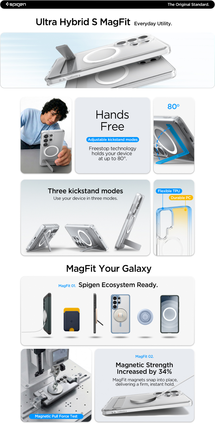 Spigen Ultra Hybrid S Magfit Case untuk Samsung Galaxy S26 Series menggabungkan desain bening premium dengan kickstand bawaan yang praktis. Tetap slim dan ringan, casing ini menampilkan keindahan asli device sekaligus memberikan perlindungan hybrid andal untuk penggunaan sehari-hari.