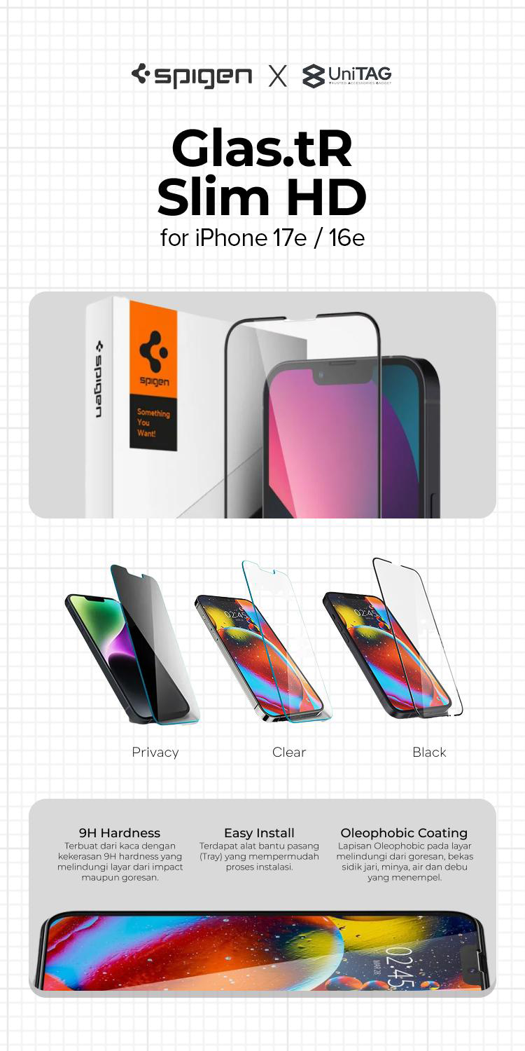 SPIGEN GlastR Slim Clear/Privacy/Full Cover Tempered Glass for iPhone 17e yang kompatibel juga dengan iphone 16e dan iphone 14 / 13 / 13 Pro ini memiliki perlindungan 9H dengan lapisan oleophobic untuk mencegah goresan dan bekas sidik jari . Terdapat variasi anti spy yang bikin layar aman terus, aktivitas ekstrim jalan terus !