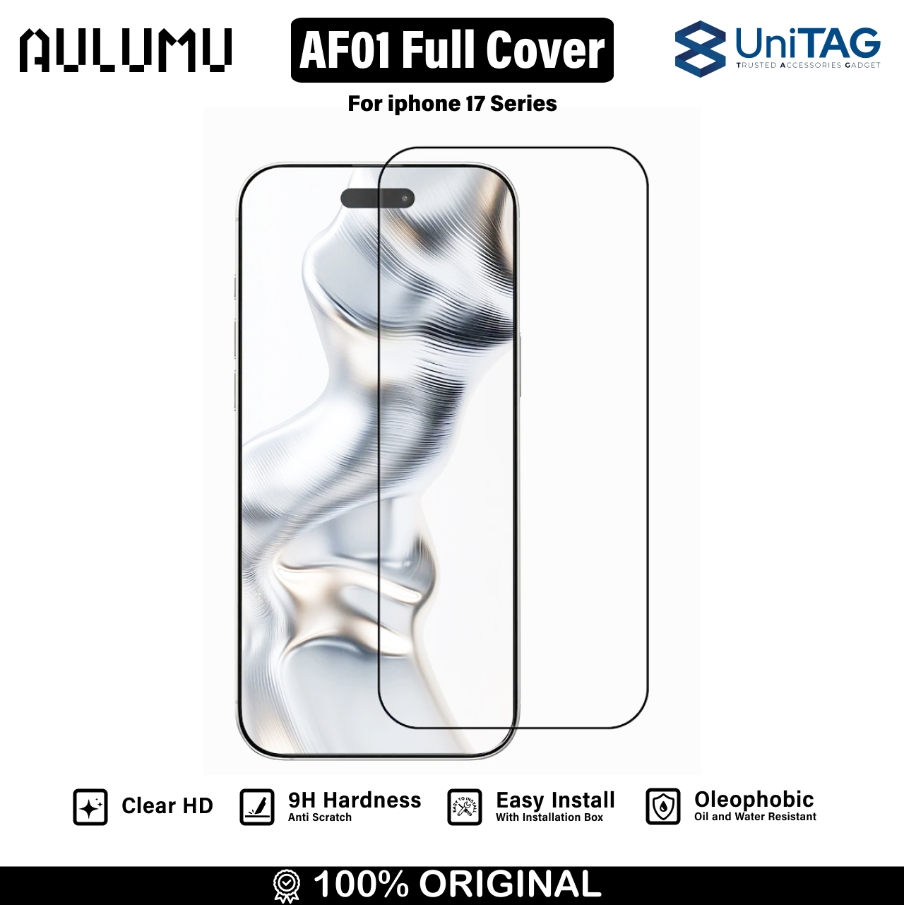 Tempered Glass Screen Protector for iphone 17 Series Aulumu AF01 Crystal Clear merupakan tempered glass dengan pinggiran hitam yang melindungi hingga ke sudut layar ditambah lapisan oelophobic serta bahan yang premium, makin aman makin keren !